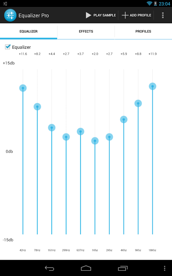 Overview: Improve your android device sound with 10 band equalizer. Equalizer Pro allows you to configure volumes of sound effects, to give you maximum enjoying, when you are listening music on your android device.