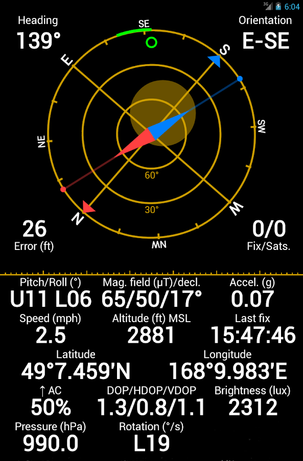 Overview: Displays GPS and sensor data: position and signal strength of satellites, accuracy, speed, acceleration, altitude, bearing, pitch, roll and battery state.