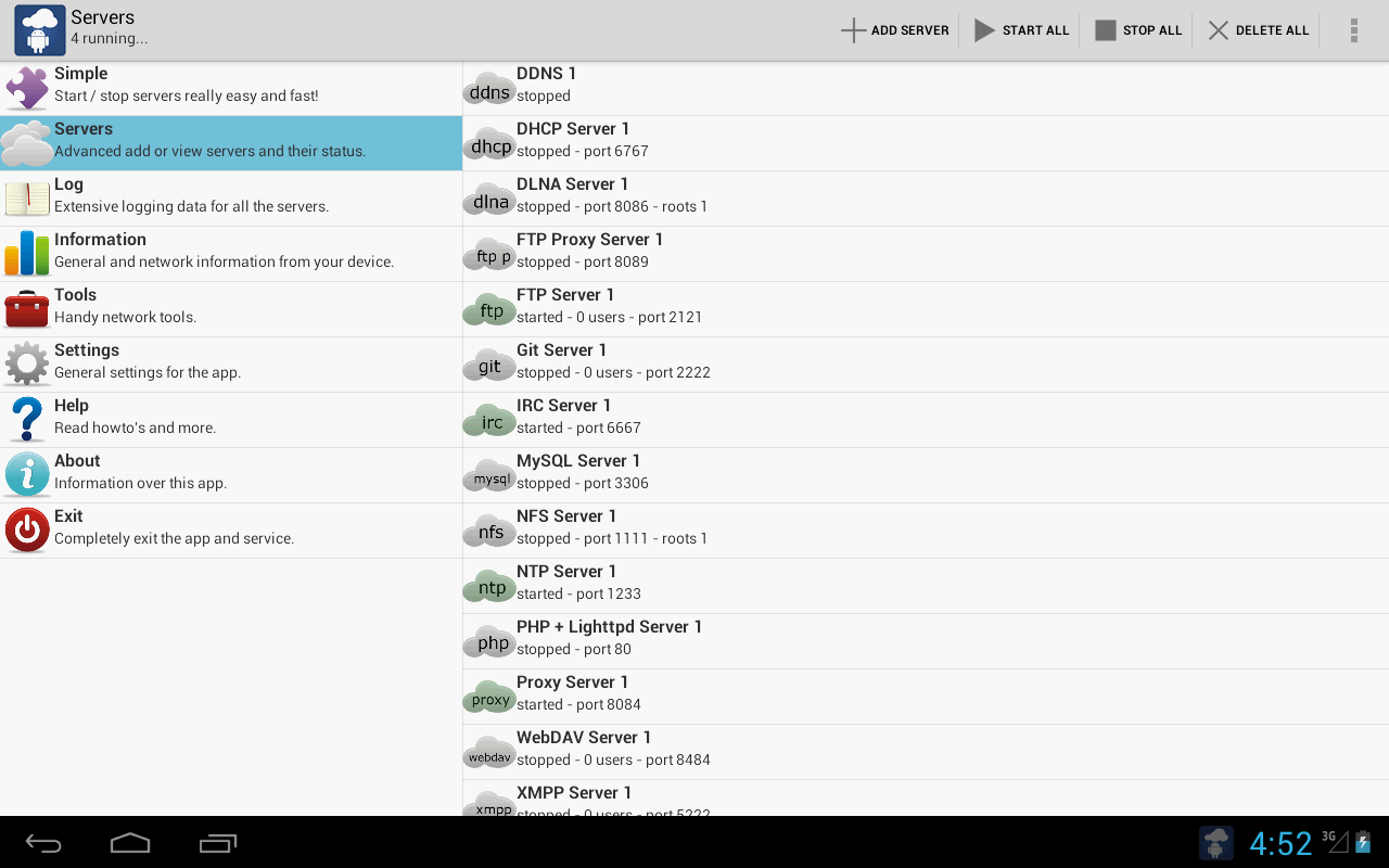 Start a server easily on the 'Simple' tab or go advanced and add users, allowed IP's, start/stop rules and more! Multiple servers can be run at the same time! No root needed, exceptions mentioned below.