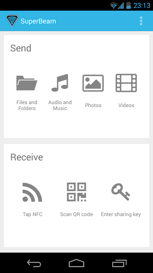 Overview: SuperBeam is the easiest and fastest way to share large files between Android devices using WiFi direct. Devices can be paired using QR codes (with the included QR code scanner) , NFC or manual sharing key (PRO).