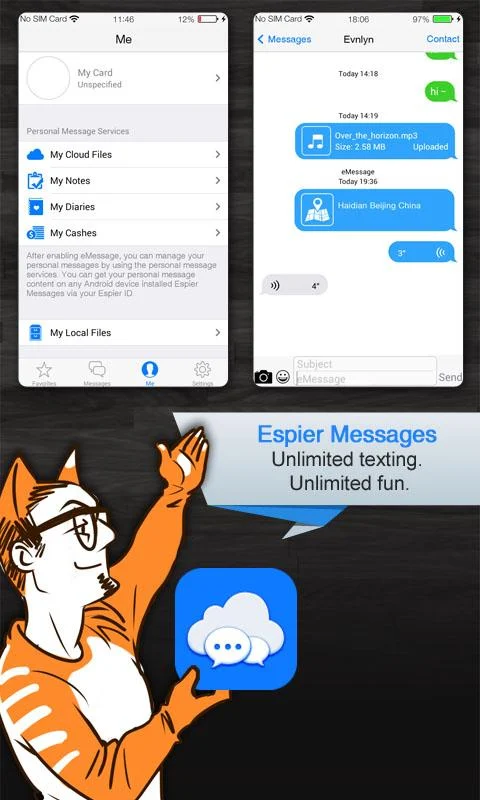 Everything can be a message! Espier Messages integrates SMS, MMS, and eMessage (one beyond Apple's iMessage). You can use it to send text, Emojis, pictures, audios, videos, and anything in your devices to your friends, whatever he/she is using Espier Messages or not.